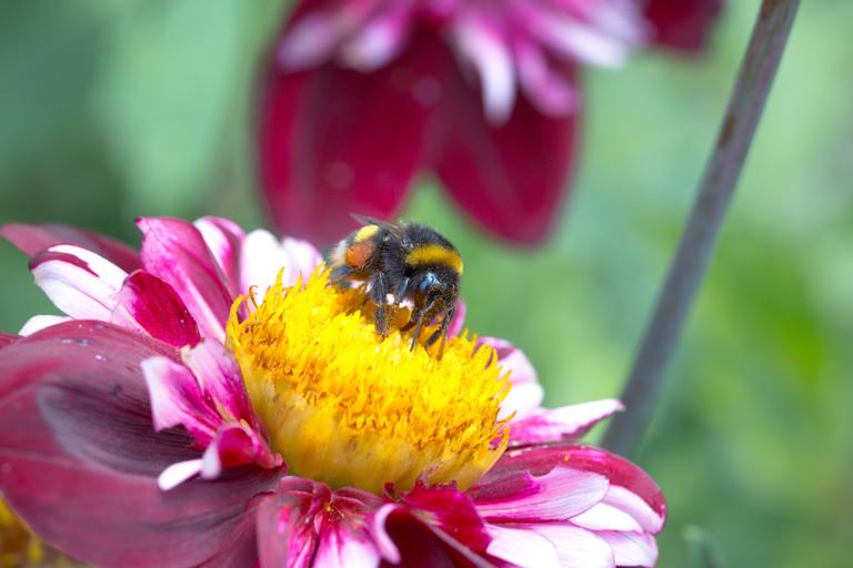 Keywords: dahlia hortensis hummel blossom bloom macro insect flower animal close dahlia neck frills-dahlia