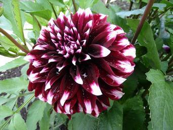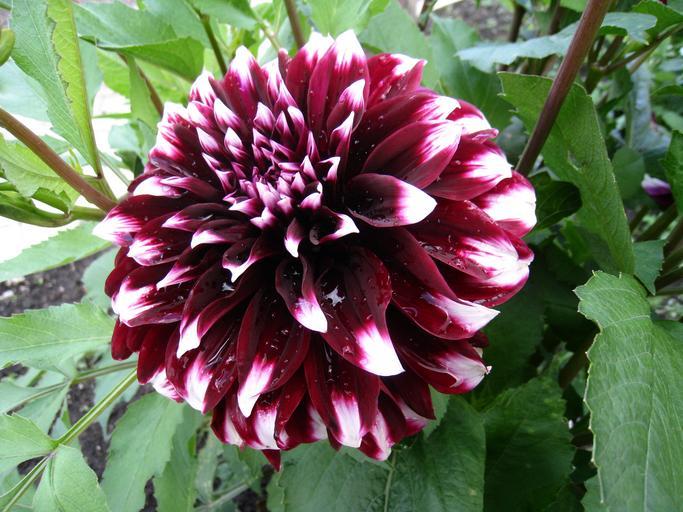 Keywords: dahlia two tone plant flower burgundy white summer garden leaf green
