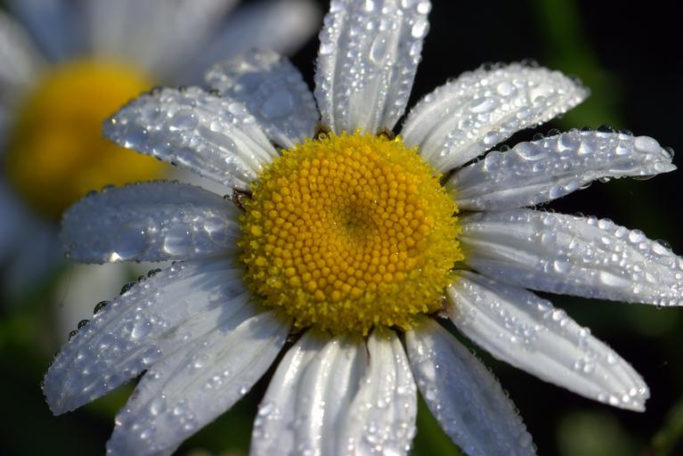 Keywords: daisies leucanthemum maximum flowers blossom bloom plant meadow margerite pointed flower drip raindrop wet fodder plant wild flower drop of water