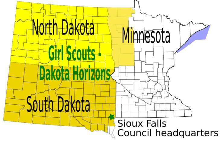 Keywords: Dakota-horizons.svg Girl Scout Council in Wyoming Created by myself but derived from the county maps uploaded to wikimedia commons and release to the public domain by en User Dbenbenn transferred from en wikipedia The Bike Dude 2007-05-19 Emma Pease Erp en This is a work in progress removed two counties in Minnesota that aren't in the new council In addition Clearwater Becker and Otter Tail counties are shared between the Dakota Horizons and a Minnesota council en Category Girl Scouts of the USA Council maps Original upload log page en wikipedia Dakota-horizons svg Upload date User Bytes Dimensions Comment 2009-01-08 23 18 04 Erp 306977 9446×6539 <small><nowiki></nowiki></small> 2007-05-19 21 04 25 Erp 305599 9446×6539 <small><nowiki></nowiki></small> 2007-05-19 20 03 33 Erp 305732 9446×6539 <small><nowiki></nowiki></small> 2007-05-19 19 50 09 Erp 305682 9446×6539 <small><nowiki>Created by myself but derived from the county maps uploaded to wikimedia commons and release to the public domain by User Dbenbenn I put it in the public domain This is a work in progress </nowiki></small> Scouting in North Dakota Scouting in South Dakota Girl Scouts of the USA Council maps |