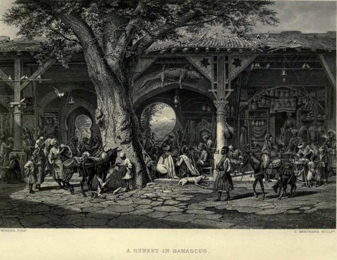 | Keywords: Damascus street 1880.jpg  smallcaps a street in damascus Picturesque Palestine Sinai and Egypt New York D Appleton Co 1881 “1883 C Bertrand engraving a sketch or watercolor by Carl Werner 1877 “79 PD-old-100 PD-US Damascus in the 1870s Streets in Damascus Picturesque Palestine Sinai and Egypt Carl Werner C Bertrand Donkeys in art Dogs in art Birds in art Trees in art |