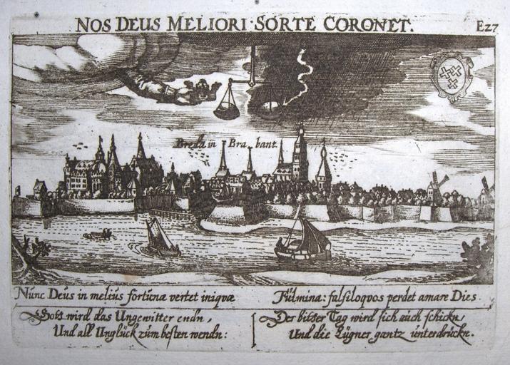 Keywords: Daniel Meisner, 1625, Breda in Brabant.jpg Artwork Creator Daniel Meisner Intellectual creator of the Thesaurus philopoliticus and author of the emblematic text for Book I Creator Eberhard Kieser director of the etcher/engraver workshop and editor of the Thesaurus philopoliticus editions Book I 1623-1626 and Book II 1627-1631 Paulus Fürst for the Sciographia cosmica edition 1637-1638 Breda in Brabant first publication in 1625 etching copper uncoloured cm 10 14 NOS DEUS MELIORI ° SORTE CORONET Emblemata titel on top Nunc Deus in melius fortuna vertet iniqvae <br />Fulmina falsiloqvos perdet amare Dies Emblem verse in Latin below the image Gott wird das Ungewitter endn / Und all Unglück zum besten wendn <br />Der bitter Tag wird sich auch schickn / Und die Lügner gantz unterdrückn Verse transcription into German This print is numbered E27 and therefore part of the later TP-edition of Paulus Fürst called Sciographia cosmica Cartografisch Antiquariaat Edward Wells BV Ermelo Netherlands ; Galleryhttp //www edward-wells nl; Infohttp //www edward-wells nl/catalogus/index php productID 2556 categoryID 209 view 60; Pichttp //www edward-wells nl/catalogus/products_pictures/large_3/2556 jpg PD-Art-100 Other versions Thesaurus Philopoliticus Engravings of cities 1625 engravings History of Breda |