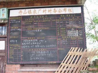 Keywords: Danshan Nongguang Village Bulletin board.jpg The Danshan Sichuan province Nonguang Village Village Public Affairs Bulletin Board provides some information on village affairs These bulletin boards have a section on family planning This bulletin boards notes that RMB 25 000 in social compensation fee family planning fines were owed in 2005 Thus far 11 500 RMB has been collected and another 13 500 RMB is yet to be collected Some local affairs bulletin boards are more detailed than others The bulletin board of the Danshan Market area Residents' Committee listed the names of all the women who had given birth recently and whether or not the birth was outside the plan One of the nine birth recorded recently was outside the plan A second child was born to one woman but as allowing by regulations According to the information on the bulletin board there are 946 women in their reproductive years with household registration in the Market area Of those 315 are subject to the Three Checks Note Sancha check for pregnancy check for intrauterine loop and check for illness End note Of the 3463 population of the Market area 327 are living away including 57 women of reproductive age own 2005-09 David Cowhig Culture of China Bulletin boards Population policy in China Planning board |