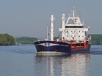 Keywords: danube delta nautical vessel freighter black sea romania tulcea danube delta bow wave displacement riparian zone loading sidearm
