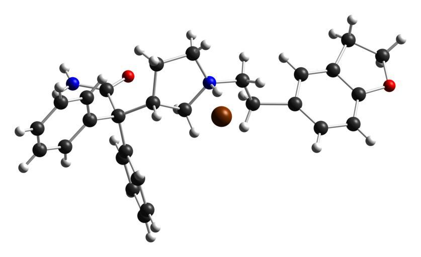 | Keywords: Darifenacin-hydrobromide-from-xtal-2009-CM-3D-balls.png Ball-and-stick model of the darifenacin molecule strictly speaking the darifenacin hydrobromide ion pair as found in the crystal structure of darifenacin hydrobromide C<sub>28</sub>H<sub>31</sub>N<sub>2</sub>O<sub>2</sub>Br Colour code Carbon C black Hydrogen H white Nitrogen N blue Oxygen O red Bromine Br red-brown Crystal structure from http //dx doi org/10 1107/S1600536809017085 Acta Cryst 2009 E65 o1286 Image generated in http //www crystalmaker com/ CrystalMaker 8 3 Own 2010-10-17 Ben Mills Benjah-bmm27 Images by Ben Mills Ball-and-stick models Darifenacin |