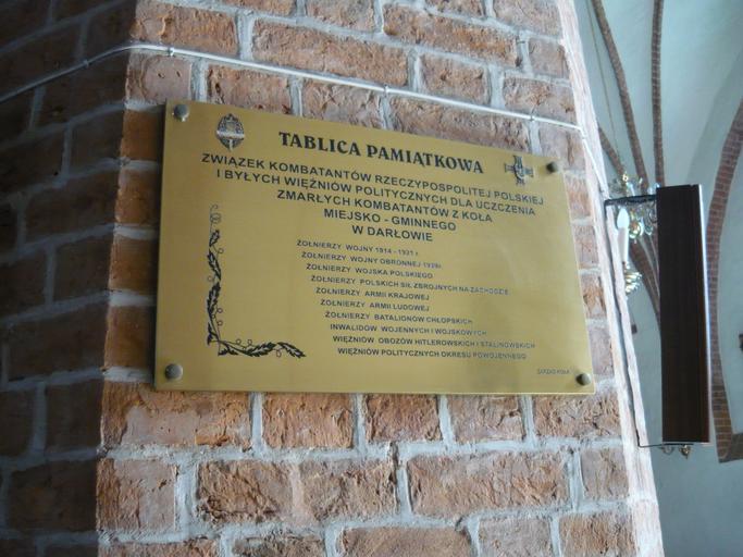 | Keywords: Darłowo-plaque of combatants.JPG en The plaque of died combatants of XX century war from Darłowo's Combatants Society and Siberia's Prisoners Society in Maria's Church pl Tablica pamiątkowa zmarłych kombatantów wojen XX wieku z Darłowskiego okręgu koła Kombatantów i Zesłańców Sybiru Kościół Mariacki own Mariochom 2011-04-18 Cc-zero Darłowo |