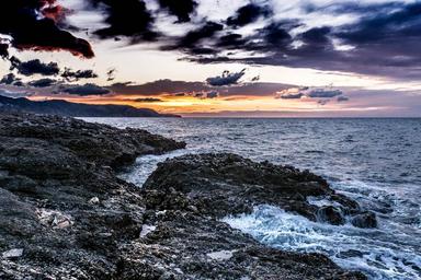 Keywords: dawn nerja malaga andalusia spain sky costa del sol holiday sun peaceful sea beach horizon stillness landscape rocks clouds