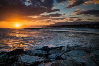 Keywords: dawn sea horizon awakening beach calm clouds sky sun rocks cala de mijas peaceful stillness