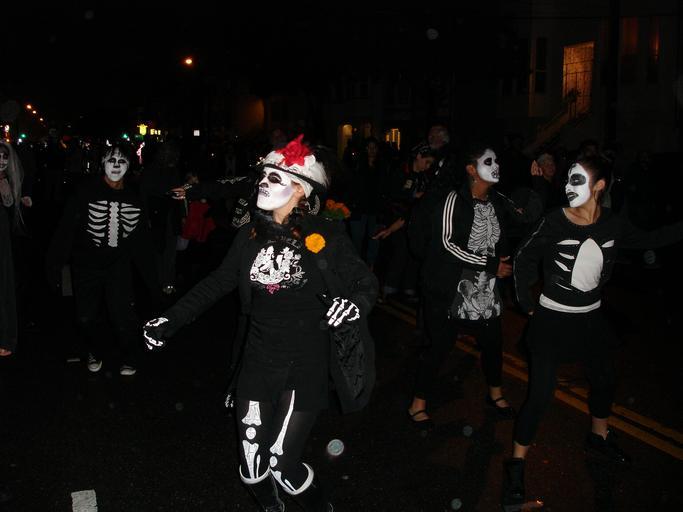Keywords: Day of the Dead (Dia de los Muertos) procession in San Francisco, 2006.JPG Day of the Dead or in Spanish Dia de los Muertos procession and altars in the Mission District San Francisco California It is annually celebrated in San Franciso since 1988 Many participants come in costumes where dark or black and white colors are prevalent with faces painted to emulate skulls or with skull masks The procession goes through several streets in the Mission District ending at the Gardfield park where altars are set up The organizers http //www dayofthedeadsf org/ explain the tradition in the following way Dia de los Muertos is a traditional Meso-American holiday dedicated to the ancestors; it honors both death and the cycle of life In Mexico neighbors gather in local cemeteries to share food music and fun with their extended community both living and departed The celebration acknowledges that we still have a relationship with our ancestors and loved ones that have passed away In San Francisco Day of the Dead has been celebrated in the Mission district since the early 70s with art music performances and a walking procession which help us contemplate our existence and mortality -- a moment to remember deceased friends and family and our connections beyond our immediate concerns For the 2013 procession the organizers described the event as follows Over 15 000 people will gather in the Mission to participate in the 26th Annual Dia de los Muertos or Day of the Dead Procession Altars Through art music and ritual this event honors our ancestors and celebrates the vitality and richness of today's community While the ceremony remains true to its Latino roots the San Francisco procession actively encourages participation by people of all origins Bring candles photos food or something that reminds you of a person that has passed away The altars are community art installations that are intended to change as each person adds something to the hearth 2006-11-02 own Al83tito cc-zero Uploaded with UploadWizard Day of the Dead in San Francisco 2006 in San Francisco |