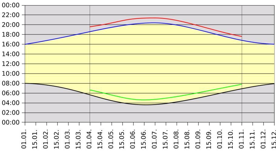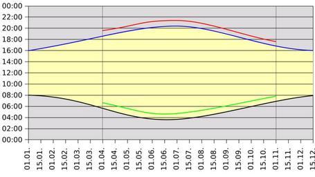 Keywords: Daylight Saving Time 3.svg Daylight Saving Time The chart plots the clock times with DST adjustment as separate lines of sunrise and sunset in Greenwich England for 2007 Durchgezogene Linie unten schwarz Uhrzeit des Sonnenaufgangs bei Normalzeit Durchgezogene Linie oben blau Uhrzeit des Sonnenuntergangs bei Normalzeit Kurze Linie unten grĂ¼n Uhrzeit des Sonnenaufgangs bei Sommerzeit Kurze Linie oben rot Uhrzeit des Sonnenuntergangs bei Sommerzeit alle Zeiten in Greenwich England 2007 Own 2008-04 Werneuchen Daylight saving time |