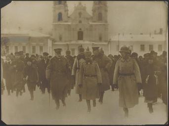 | Keywords: De Duitsche troepen bij den opmarsch in het bezette Minsk..jpg  nl De Duitsche troepen bij den opmarsch in het bezette Minsk Generaal-veldmaarschalk von Eichhorn links en generaal von Bredow rechts met officieren van den staf bezichtigen de pas ingenomen stad be  ямецкія войскі на ма шы ў акупаваным  інску Гене ал-фельдма шал фон Эйнха н злева і гене ал фон Б эдаў сп ава з суп ацоўнікамі пе саналу наведалі нядаўна заняты го ад 1918 http //afbeeldingen gahetna nl/naa/thumb/1280x1280/536e321b-d957-4407-96f2-162a6dd3d2a9 jpg onbekend Custom license marker 2013 02 05 PD-old Uploaded with UploadWizard 1914 in Minsk Hermann von Eichhorn Freedom square Minsk History of the Archcathedral of Name of the Blessed Virgin Mary in Minsk Jesuit College in Minsk |