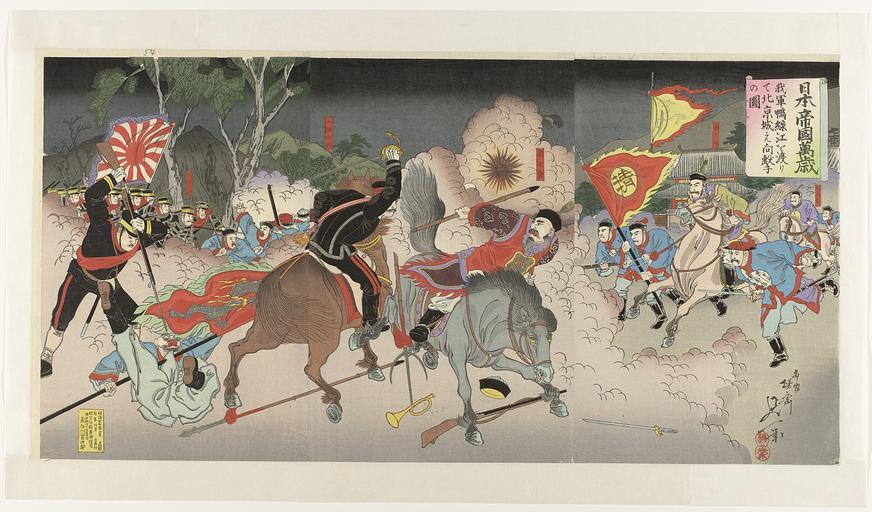 | Keywords: De heroîsche strijd en bezetting van Jiuliancheng-Rijksmuseum RP-P-2010-310-56.jpeg accession number RP-P-2010-310-56 Adachi GinkôAdachi GinkôWakasaya Yoichi Jakurindô credit line nl Japanse en Chinese soldaten vechten voor de poort van de stad Jiuliancheng in Mantsjoerije Deze slag vond plaats op 26 oktober 1894 tijdens de Eerste Chinees-Japanse Oorlog 1894-1895 Label Line mentioned on object Adachi Ginkô 1894 kleurenhoutsnede; lijnblok in zwart met kleurblokken Collection prenten; Japan collectie blad Height mm 374 blad Width mm 726 exhibition history paper object history Acquisition 2009-10-13 object type prent PD-US PD-old Data and photography rights All data and all images made available through the API are either in the public domain or are subject to a CC0 license https //www rijksmuseum nl/en/api/terms-and-conditions-of-use cc-zero place of creation Japan http //www rijksmuseum nl/collectie/RP-P-2010-310-56 http //hdl handle net/10934/RM0001 COLLECT 489986 handle De heroîsche strijd en bezetting van Jiuliancheng Uploaded with GWToolset Rijksmuseum RP-P-2010-310-56 http //www rijksmuseum nl/media/assets/RP-P-2010-310-56 Images uploaded by Fæ Images from the Rijksmuseum Japanese 19th-century prints in the Rijksmuseum Amsterdam |