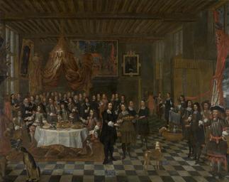 Keywords: De ontvangst van Charles II en zijn broers door het Brugse Sint-Barbaragilde.jpg Artwork Creator Jan Baptist van Meunincxhove nl Dit schilderij toont het feestmaal dat op 2 oktober 1656 door de Brugse Sint-Barbaragilde de gilde van de busschieters of kolveniers werd aangeboden aan de Engelse koning Charles II en zijn broers Jacob Stuart hertog van York en Henry Stuart hertog van Gloucester ter gelegenheid van hun bezoek aan Brugge De vorst en zijn beide broers waren net als nieuwe leden in de gilde opgenomen Jacob Stuart was er bij die gelegenheid in geslaagd om de hoofdvogel de 'papegay' af te schieten Het banket is gesitueerd in het gildelokaal Links zitten de koning en zijn broers samen aan een ronde tafel met allerlei gerechten De gildehoofdman presenteert knielend de erewijn aan de hertog van York Tussen beide laatste personages staat de bisschop van Brugge Carolus van den Bosch Achter de tafel staat het volledige gildekorps en tal van tafeldienaren en erewachten Tegen de achterwand bemerkt men als anachronistisch curiosum de geschilderde voorstelling van de ontvangst van Charles II in de Schuttershof het in 1671 gedateerde pendant van dit schilderij Aan weerszijden van dit grote schilderij hangen de portretten van Henry en Jacob Stuart; beide werken zijn verloren Naar H Vlieghe Stedelijke Musea Brugge Catalogus Schilderijen 17de en 18de eeuw Brugge 1994 pp 186-187 1671 oil canvas cm 249 199 Institution Groeningemuseum accession number 000GRO1377 I object history credit line exhibition history 1 Lukas Art In Flanders Imagebank<br/>2 http //www lukasweb be/fr/photo/la-reception-de-charles-ii-et-ses-freres-dans-la-guilde-de-saint-barbara-a-bruges Lukas - Art in Flanders VZW PD-old-100 DEFAULTSORT Meunincxhove Jan Baptist van; Reception of Charles II; Groeningemuseum Jan Baptist van Meunincxhove Uploaded with UploadWizard Paintings in Groeningemuseum Charles II of England Paintings of Bruges |