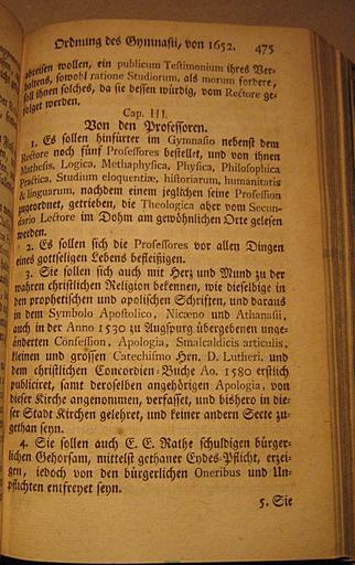 | Keywords: De Ordnung des Gymnasii 475.jpg De_Ordnung_des_Gymnasii_ jpg 474 476 This is a scan of the historical document with the title <br/> Ordnung des Gymnasii aus/ From Sammlung Hamburgischer Gesetze und Verfassungen Der Achte Theil Photo from original book 1770 Klefeker Johann Ed PD-old-100 De Ordnung des Gymnasii |