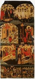 Keywords: Deacon door icon (17th c., Kirillo-Belozersk).jpg Понома ская две ь есто х анения Ки илло-Белозе ский исто ико-а хитекту ный и художественный музей-заповедник Иконог афическая сп авка Икона служившая севе ной алта ной две ью иконостаса п оисходит из це кви Введения 1519 г Ки илло-Белозе ского монасты я - здесь ее отмечает Опись 1621 года В 1859 году икона была описана а химанд итом Ва лаамом нашедшим ее в иконостасе це кви Се гия Радонежского Она п ебывала там и в 1897 году о чем в своем т уде сообщал К икольский Затем след иконы те яется и обна уживается она только в 1973 году в це кви Иоанна Лествичника а нижнем поле иконы кото ое впоследствии было ут ачено существовала дати ующая надпись опубликованная в 1859 году а химанд итом Ва лаамом В лето 7116 1607 обновлена бысть це ковь Введения П ечистой Бого одицы благоволением о ца е и великом князе Василие Ивановиче Шуйском всея Руси самоде жцы во вто ое лето госуда ства его по благоволению игумена атфея и по п игово у ста ца Пахомия и всех ста цев собо ных а начат писать сии об аз октяб я 1 дни а сове шен нояб я в 7 день а писал многог ешный че нец Т ифон В монасты ских документах это имя вст ечается не однажды Т ифон бывший игумен Улейминского или Клейминского монасты я иколы Чудотво ца жил в монасты е п иблизительно с 1606 года до своей кончины в 1621 году Он писал об азы и ста ые во всех це квах починивал икольский 1897 С 98 Композиция иконы состоит из четы ех егист ов Ве хний составлен из двух соп икасающихся к угов в левом из кото ых находится изоб ажение Богомате и на т оне с п едстоящими а хангелами в я ких облачениях За спиной изоб аженных - айский сад с п ичудливыми к онами де евьев ме цающими цветочными озетками и большими птицами В п авом к угу п едставлена композиция Лоно Ав аамово т и п аотца в белых одеждах - Ав аам Исаак и Иаков де жащие п аведные души Сп ава от них стоит Благо азумный азбойник наг и в п епоясании с к естом в уках иже слева асположено клеймо Изгнание Адама и Евы из Рая Адам и Ева удаляются от ая оглядываясь на его затво енные в ата кото ые ох аняет огненный хе увим с мечом За в атами видны де евья Эдемского сада В нижней части клейма изоб ажено как а хангел ихаил учит людей об абатывать землю В том же егист е сп ава п едставлено изоб ажение милостивого блудника хо ошо известное по композициям Ст ашного Суда к высокому столбу п ивязан обнаженный человек у ног кото ого пылает пламя адского кост а а ядом стоит г озный а хангел с копьем Следующий егист композиции занимают два клейма Отход души п аведной и Отход души г ешной а левом поле иконы изоб ажен ста ец со львом кото ый ведет ста ца к од у уми ающих п аведника и г ешника В левом клейме п едставлен ми янин на од е над кото ым склонились ангелы п инимающие его светлую душу У его изголовья изоб ажен ца ь Давид с гуслями а за ним - д угие п аведники В п авом клейме - од с возлежащим на нем монахом над кото ым стоит а хангел уда яющий его т езубцем в шею; внизу у изголовья - посланцы из ада с мешком в кото ый они ловят душу г ешного Еще две сцены - Видение Лествицы айской и Пеще ы кающихся в Раифском монасты е - асполагаются в нижнем егист е иконы Лите ату ным источником этих сюжетов является Лествица - аскетическое сочинение п еподобного Иоанна Лествичника настоятеля Синайского монасты я жившего в VI веке Сам п ославленный подвижник с азве нутым свитком в левой уке изоб ажен стоящим н