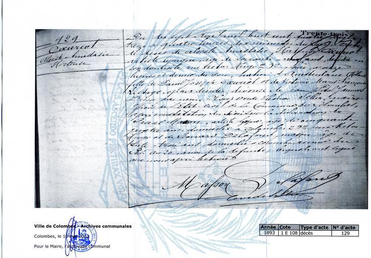 Keywords: Death certificate of Alceste COEURIOT - 1893.jpg fr Acte de décès d'Alceste Coeuriot communiqué par les Archives Municipales de Colombes le 10 mai 2012 publié avec leur aimable autorisation <br/> Transcription<br/>Du dix sept Avril mil huit cent quatre vingt treize à quatre heures dix minutes du soir acte de décès de Alceste Anastasie Hortense CÅ“uriot artiste lyrique âgé de soixante-neuf ans décédé en son domicile rue Victor Hugo 232 hier à onze heures et demie du soir native d ™Amsterdam Hollande fille de Paul Joseph CÅ“uriot et Victoire Marie Françoise Lestage époux décédés divorcée de Jean Vital Jammes Dressé par nous Co Oreste Eléonor Sellier maire officier de l ™Ã©tat-civil de la commune de Colombes après constatation du décès sur la déclaration de Pascal Masson artiste lyrique âgé de cinquante quatre ans domicilié à Colombes 232 rue Victor Hugo et de Léonard Delafond maçon âgé de trente-trois ans domicilié à Colombes avenue du au 26 amis de la défunte lesquels ont signé avec nous après lecture<br/> Masson Delafond<br/> Co Sellier<br/> En marge 129 CÅ“uriot Alceste Anastasie Hoortense 2012-05-10 Scan by Jean GUERIN 2012 Muinicipal archives of Colombes Hauts-de-Seine France - Cote 1 E 108 - Death certificate 1893 PD-Art Uploaded with UploadWizard Jean-Vital Jammes - French « État-civil » documents |