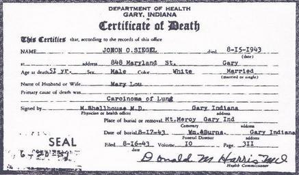 Keywords: Death certificate of John Otto Siegel, front view.jpg Uploaded with en wp UW marker 2013 06 14 Death certificate of John Otto Siegel front view http //home ancestry com/ 1943-08-16 Department of Health Gary Indiana Medal of Honor families John Siegel Medal of Honor documentation 1943 documents PD-USGov |