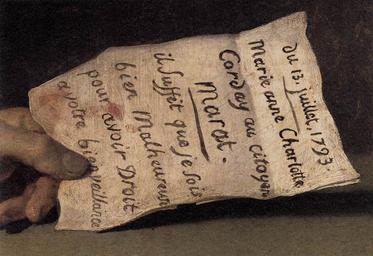 | Keywords: Death of Marat by David (detail).jpg Artwork Creator Jacques-Louis David The Death of Marat 1793 Oil on canvas Institution Royal Museums of Fine Arts of Belgium object history credit line accession number WGA link 6070 http //www wga hu/art/d/david_j/3/302david jpg http //www wga hu/html/d/david_j/3/302david html PD-old-100 painting historical French 1801-1850 WGA form painting WGA type historical WGA School French WGA time period 1801-1850 La Mort de Marat Jacques-Louis David Details of paintings by Jacques-Louis David 13 July 1793 in France Charlotte Corday Manuscripts 18th-century manuscripts French manuscripts |