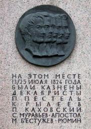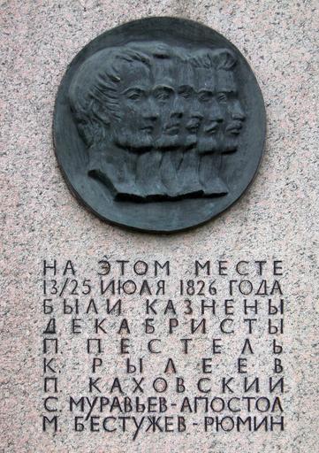 Keywords: DecembristsExecutionPlaque.jpg Decembrists' Memorial St Petersburg The inscription reads lang ru а этом месте 13/25 Июля 1826 года были казнены Декаб исты П Пестель К Рылеев П Каховский С у авьев-Апостол бестужев-Рюмин English en At this place 13/25 July 1826 were executed the Decembrists P Pestel K Ryleyev P Kakhovsky S Muravyov-Apostol and M Bestuzhev-Ryumin décabriste à Saint-Pétersbourg lang ru а этом месте 13/25 Июля 1826 года были казнены Декаб исты П Пестель К Рылеев П Каховский С у авьев-Апостол бестужев-Рюмин Français fr ce stade 13/25 juillet 1826 furet exécutés les décabristes P Pestel K Ryleïev P Kakhovski S Mouraviov-Apostol et M Bestoujev-Rioumine Own Wilson44691 photograph taken by Mark A Wilson Department of Geology The College of Wooster http //www3 wooster edu/geology/MWilson html 2009-06-16 Five Decembrists medal |