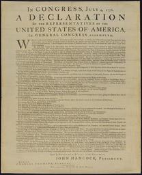 | Keywords: Declaration of Independence. In Congress, July 4, 1776, a Declaration by the Representatives of the United States of America, in General Congress Assembled. WDL109.jpg Artwork ru Джеффе сон Томас 1743-1826 fr Jefferson Thomas 1743-1826 en Jefferson Thomas 1743-1826 zh 斐 托马斯 1743-1826 pt Jefferson Thomas 1743-1826 ar جيفيرسون توماس 1743-1826 es Jefferson Thomas 1743-1826 ru Декла ация независимости Конг есс 4 июля 1776 года Декла ация п едставителей Соединенных Штатов Аме ики соб авшихся на общий конг есс fr Déclaration d'indépendance Au Congrès le 4 juillet 1776 une déclaration des représentants des États-Unis d'Amérique rassemblés en Congrès général en Declaration of Independence In Congress July 4 1776 a Declaration by the Representatives of the United States of America in General Congress Assembled zh 独立宣 : 1776 年 7 4 日的大陆会议,由参与大会的美利 联合的各邦代表们发表的宣 pt Declaração da Independência No Congresso 4 de Julho de 1776 uma Declaração dos Parlamentares dos Estados Unidos da América no Congresso Geral Reunido ar إعلان الاستقلال في الكونغرس، 4 تموز 1776، إعلان من قبل ممثلي الولايات المتحدة الأمريكية، في الاجتماع العام للكونغرس ru Данный документ является пе вой печатной ве сией аме иканской Декла ации независимости 7 июня 1776 года Ген и Ли из штата Ви гиния выступил с п едложением внести езолюцию п изывающую Конг есс заседающий в Филадельфии объявить независимость от Великоб итании Четы е дня спустя Томас Джеффе сон Джон Адамс Бенджамин Ф анклин Родже Ше ман и Робе т Р Ливингстон были назначены членами комитета по составлению текста декла ации независимости Че новой ва иант документа был зачитан в Конг ессе 28 июня 4 июля Конг есс п инял Декла ацию независимости в кото ой п иводился пе ечень п етензий к Б итанской импе ии Документ был напечатан и азослан по всем колониям в виде к упнофо матных листовок К упнофо матные листовки п едставляли собой большие листы бумаги с текстом напечатанным как п авило с одной сто оны и являлись популя ным способом быст ого асп ост анения важной инфо мации в XVIII веке Листовки вывешивались в мэ иях и кофейнях зачитывались в це квях и на общественных соб аниях часто пе епечатывались а выде жки из них п иводились в местных газетах <br>Автономия; Плакаты; Данлэп Джон 1747-1812 гг ; Соединенные Штаты - Декла ация независимости fr Ce document est la première version imprimée de la Déclaration d'indépendance américaine Le 7 juin 1776 Richard Henry Lee de Virginie présenta une résolution exhortant le Congrès réuni à Philadelphie à déclarer son indépendance vis-à-vis de la Grande-Bretagne Quatre jours plus tard un comité composé de Thomas Jefferson John Adams Benjamin Franklin Roger Sherman et Robert R Livingston fut nommé pour rédiger une déclaration d'indépendance L'ébauche du comité fut lue devant le Congrès le 28 juin Le 4 juillet le Congrès adopta la Déclaration d'indépendance qui contenait une liste de griefs contre la couronne britannique Le document fut imprimé et distribué à travers les colonies sous la forme d'un « placard » Les placards étaient de grandes feuilles de papier généralement imprimées sur un seul côté qui étaient populaires au XVIIIe siècle pour diffuser rapidement les informations importantes Ils étaient affichés dans les hôtels de ville et les tavernes lus dans les églises et pendant les réunions publiques et souvent reproduits ou cités dans les journaux locaux <br>Autonomie; Placards; Dunlap John 1747-1812; États-Unis - Déclaration d'indépendance en This document is the first printed version of the American Declaration of Independence On June 7 1776 Richard Henry Lee of Virginia introduced a resolution urging Congress meeting in Philadelphia to declare independence from Great Britain Four days later Thomas Jefferson John Adams Benjamin Franklin Roger Sherman and Robert R Livingston were appointed as a committee to draft a declaration of independence The committee s draft was read in Congress on June 28 On July 4 Congress adopted the Declaration of Independence containing a list of grievances against the British crown The document was printed and circulated throughout the colonies in the form of a broadside Broadsides were large sheets of paper usually printed on one side that were popular in the 18th century as a means for the rapid distribution of important information They were posted in town halls and coffee houses read in churches and public meetings and often reprinted or excerpted in local newspapers <br>Autonomy; Broadsides; Dunlap John 1747-1812; United States -- Declaration of Independence zh 这份文件是第 次印刷的首版 美国独立宣 1776 年 6 7 日,理查德·亨利· 提出决议, 促 费城 会的国会宣布从英国独立 四天后,托马斯· 斐 约翰