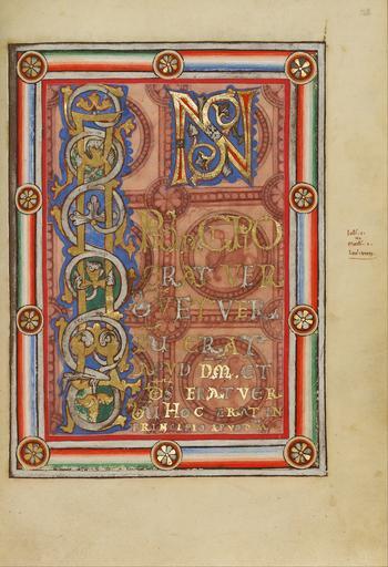 | Keywords: Decorated Incipit Page - Google Art Project (6853068).jpg This page opens Saint John's Gospel with the words In principio erat verbum et verbum erat apud deum et deus erat verbum; hoc erat in principio apud deum In the beginning was the word and the word was with God; and the word was God; the same was in the beginning with God The grand I on the left is the first and largest of the letters followed by the N at the upper right Decorated with leaves vines and filigree the letters continue in descending scale A design reminiscent of the appearance of expensive imported Byzantine silks provides a fitting background for the gold and silver letters This lavish adornment of a page devoted entirely to words reinforces the text's message that Christianity is a religion of the word None 430703 Unknown /collection/the-j-paul-getty-museum/artwork/decorated-incipit-page-unknown/6853068/ Unknown illuminator /collection/the-j-paul-getty-museum/ The J Paul Getty Museum 343005 http //www getty edu/museum 3/12/2012 5 16 21 PM /collection/the-j-paul-getty-museum/artwork/decorated-incipit-page-unknown/6853068/ 1120 about 1120 - 1140 Tempera colors gold and silver on parchment 229 6853068 True 1140 3/25/2012 2 23 09 PM lido getty edu-gm-obj110054 http //www getty edu/art/gettyguide/artObjectDetails artobj 110054 http //www getty edu/legal/copyright html Folio 1120 1150 Helmarshausen Germany Creation w165 x h229 cm about 1120 - 1140 False 0 68359375 Part decorated-incipit-page-unknown Decorated Incipit Page d 165 Tempera colors gold and silver on parchment http //www getty edu/legal/copyright html special url_id EQEuJwRLYbPKDA PD-old-100 MS LUDWIG II 3 Getty museum - Gospel book from Helmarshausen Google Art Project works by unknown artist N as an initial Gospel of John - Chapter 1 |