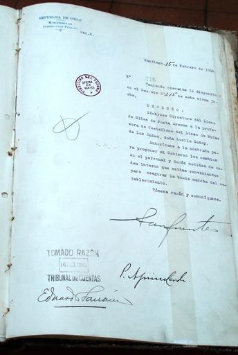 | Keywords: DecretoGabrielaMistral.JPG Decreto del Presidente de Chile Juan Luis Sanfuentes con la firma del Ministro de Justicia e Instrucción Pública Pedro Aguirre Cerda por el cual se designa a Lucila Godoy Gabriela Mistral como Directora del Liceo de Niñas de Punta Arenas En el Archivo Nacional de Chile Own 12-3-2007 Ricardo Hevia Kaluf Juan Luis Sanfuentes Pedro Aguirre Cerda Gabriela Mistral | ||||