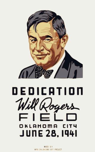 | Keywords: Dedication Will Rogers Field, Oklahoma City, WPA poster (LOC cph.3f03736).svg ;Title Dedication Will Rogers Field Oklahoma City June 28 1941 ;Related Names Federal Art Project sponsor ;Date Created/Published Oklahoma WPA Oklahoma Art Project 1941 ;Medium 1 print on board poster silkscreen color ;Summary Poster for dedication of Will Rogers Field showing head-and-shoulders portrait of Will Rogers facing slightly left ;Rights Advisory No known restrictions on publication ;Call Number POS - WPA - OK 01 D42 no 1 B size P P P P ;Repository Library of Congress Prints and Photographs Division Washington D C 20540 USA ;Notes Date stamped on verso Jul 7 1941 Work Projects Administration Poster Collection Library of Congress ;Subjects Rogers Will --1879-1935--Commemoration--Oklahoma--Oklahoma City Dedications--Oklahoma--Oklahoma City--1940-1950 ;Format Portrait prints--1940-1950 Posters--1940-1950 Screen prints--Color--1940-1950 ;Collections http //www loc gov/pictures/collection/wpapos WPA Posters ;Bookmark http //www loc gov/pictures/item/92500645 loc-image cph 3f03736 PD-USGov-WPA Will Rogers Will Rogers World Airport 1941 in Oklahoma SVG posters PD-USGov |