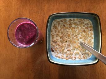 Keywords: breakfast indoor food No that's no glass of beet juice. The intense color is from prickly pear cactus fruit. No that's no glass of beet juice. The intense color is from prickly pear cactus fruit.
