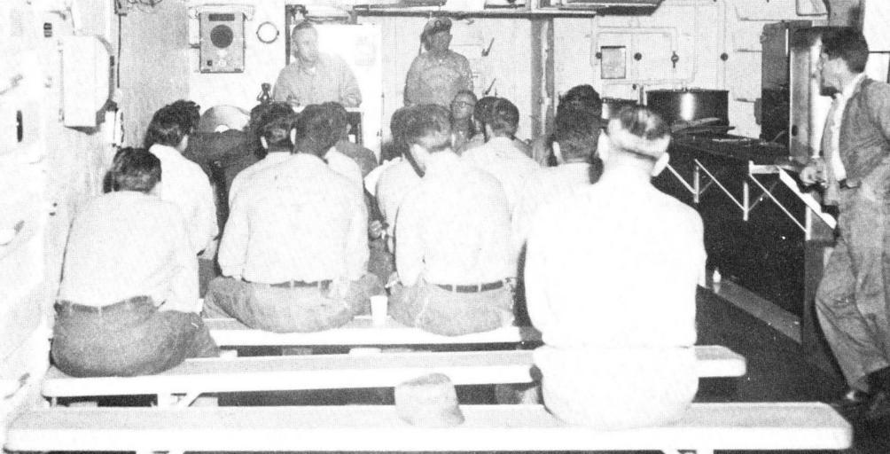 | Keywords: Deepfreeze I 471b.jpg Lt Harry Divens the officer in charge of detachment bravo cargo handling battalion three delivering a lecture on safety precautions to cargo handling personnel during the voyage to the Antarctic Lt Divens detachment was assigned to the task force for the duration of the operation This detachment helped to onload approximately 21 000 measurement tons of cargo at Kainan Bay and McMurdo Sound Report of Operation DEEPFREEZE I 1955-56 U S Navy Task Force 43 Washington D C 843 pp 1956 United States Navy Original work of the US Federal Government - public domain PD-USGov Operation Deep Freeze I |