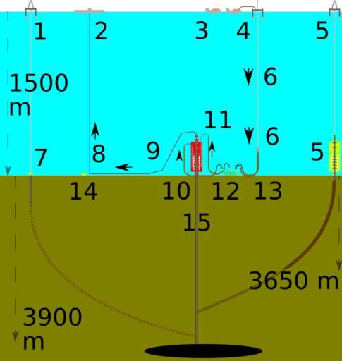 | Keywords: Deepwater Horizon oil spill recovery context numbered.svg  en contextual overview of the Deepwater Horizon oil spill recovery area showing both sea surface and subsea Scale has been altered for clarity and only the main equipment is shown At the centre is a subsea blowout preventer stack installed on the seabed with a riser insertion tube in place to its left and kill and choke lines connected to a top kill mud manifold to its right Relief wells 1 and 2 are shown at the extreme right and left each drilling down to meet the blown centre well Legend red represents the blowout preventer stack grey represents the oil flow passage see 15 9 and 8 white tubing represents the kill left 10 and choke right 11 lines brown represents the top of the subsea well casing above 15 the five grey rectangles within the lower red shape represent ram-type blowout preventers the two grey rectangles within the upper red shape represent annular-type blowout preventers the orange pipes are flexible hoses connected to various rigid pipes above 10 12 and 13 Key 1 Relief Well 2 Development Driller II 2 Discoverer Enterprise 3 Kill mud ships 4 Top Kill Helix Q4000 5 Relief Well 1 Development Driller III 6 Mud pumped down by Helix Q4000 7 Relief Well 2 being drilled by Development Driller II 8 Riser Insertion Tube riser to sea surface 9 broken riser from top of blowout preventer BOP 10 Kill line into BOP 11 Choke line into BOP 12 Manifold for kill mud 13 Flexible hose interconnecting the mud pipes and manifold 14 Subsea Dispersion Injection System at end of broken riser 15 Oil well head Own illustration created with approximate reference to the following sources http //www offshore-mag com/index/article-display/323550/articles/offshore/equipment-engineering/us-gulf-of-mexico/cameron-wins-evo-subsea-bop-stack-contract html BP technical briefing linked at http //www offshore-mag com/index/article-display/5210928327/articles/offshore/deepwater-horizon/deepwater-horizon14 html Kent Wells technical update video linked at http //bp concerts com/gom/kentwells_update24052010 htm especially the illustration at time 6 54 BBC diagram at http //news bbc co uk/2/hi/world/us_and_canada/10159626 stm Economist diagram at http //media economist com/images/images-magazine/2010/21/ST/201021STC294 gif Using Inkscape 0 47 2010-05-30 User 84user thumb left Large context with large text font thumb left Large context with largest practical font size thumb left Large context numbered instead of text thumb left Subsea blowout preventer stack with top kill mud lines shown unattached thumb left stack with top kill mud lines attached thumb left stack set up for a top kill plus riser insertion tube thumb left stack in top kill mode plus riser insertion tube and kill mud manifold thumb left large context with small font showing both sea surface and subsea validSVG http //validator w3 org/check uri Created with Inkscape Oceanographic diagrams Blowout preventers Deepwater Horizon oil spill Language-neutral diagrams |