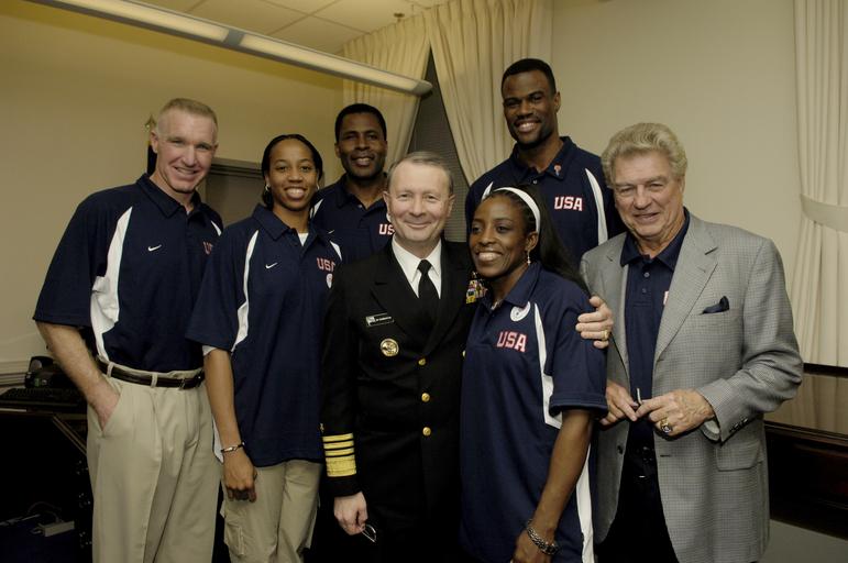 Keywords: Defense.gov News Photo 060406-N-0696M-015.jpg en Vice Chairman of the Joint Chiefs of Staff Adm Edmund G Giambastiani Jr U S Navy poses for photos with members of Team USA in the Pentagon in Arlington Va on April 6 2006 The basketball superstars are in the Pentagon to hold a special basketball clinic for children of deployed and active duty military members as part of April's National Month of the Military Child From left are Chris Mullin Chasity Melvin Buck Williams Giambastiani Ruthie Bolton David Robinson and Chuck Daly 060406-N-0696M-015 Navy http //www defense gov/photos/newsphoto aspx newsphotoid 7855 2006-04-06 en Petty Officer 1st Class Chad J McNeeley U S Navy PD-USGov-Military-Navy Defense gov news media for April 2006 Import by User Slick-o-bot/Defense gov News Photos Edmund P Giambastiani Taken with Nikon D2X Chasity Melvin Chris Mullin basketball David Robinson Chuck Daly Buck Williams Ruthie Bolton