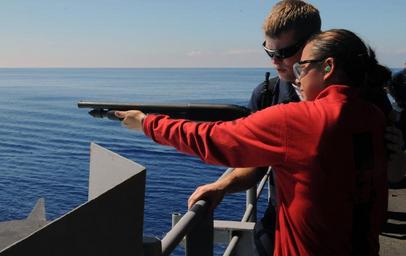 Keywords: Defense.gov News Photo 090611-N-2344B-153.jpg en U S Navy Seaman Andrew Just supervises Petty Officer 3rd Class Ashley Tabotabo as she fires a 12-gauge shotgun during a live-fire exercise aboard the aircraft carrier USS Ronald Reagan CVN 76 in the Pacific Ocean on June 11 2009 The G-2 division of the Ronald Reagan's weapons department holds live-fire exercises regularly to give sailors the opportunity to qualify for the 12-gauge shotgun the 9 mm pistol and the M-16 rifle 090611-N-2344B-153 http //www defense gov/photos/newsphoto aspx newsphotoid 11384 2009-06-11 en Petty Officer 3rd Class Briana C Brotzman U S Navy PD-USGov-Military Import by User Slick-o-bot/Defense gov News Photos Taken with Nikon D300 Firearms training on USS Ronald Reagan CVN-76 |