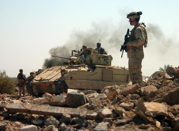 | Keywords: Defense.gov News Photo 050326-N-6501M-022.jpg en U S Army soldiers and a Bradley Fighting Vehicle with the 2nd Battalion 11th Armored Cavalry Regiment cautiously advance into a bunker area as they conduct a raid on the Hateen Weapons Complex in Babil Iraq on March 26 2005 The 11th Armored Cavalry is attached to the 155 Brigade Combat Team headquartered in Tupelo Miss 050326-N-6501M-022_ Navy http //www defense gov/photos/newsphoto aspx newsphotoid 6359 2005-03-26 en Chief Petty Officer Edward Martens U S Navy PD-USGov-Military-Navy Defense gov news media for March 2005 Mississippi Iraq War Bradley Fighting Vehicles Import by User Slick-o-bot/Defense gov News Photos Defense gov photos requiring renaming Photos taken with Nikon D2H Bradley IFV |