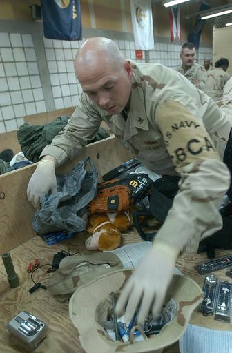 | Keywords: Defense.gov News Photo 050301-N-6027E-001.jpg en Navy Petty Officer 2nd Class Jeffrey Oberts performs a customs inspection on a U S Army soldier's duffle bag at Camp Doha Kuwait on March 1 2005 Oberts is a Navy reservist with Navy Expeditionary Logistics Support Force Forward Oscar Bravo Company which is performing the customs mission for the U S Army throughout Kuwait and Iraq 050301-N-6027E-001 Navy http //www defense gov/photos/newsphoto aspx newsphotoid 6210 2005-03-01 en Chief Petty Officer Kevin Elliott U S Navy PD-USGov-Military-Navy Defense gov news media for March 2005 Iraq War Kuwait Import by User Slick-o-bot/Defense gov News Photos Defense gov photos requiring renaming United States Army |