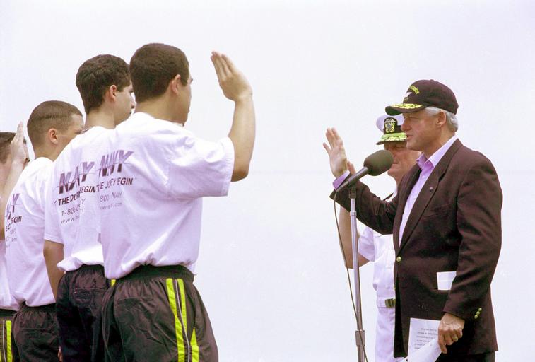 Keywords: Defense.gov News Photo 000704-N-5636A-001.jpg en President Bill Clinton administers the oath of enlistment to new Navy recruits in a special ceremony on board the USS John F Kennedy CV 67 in New York harbor on July 4 2000 The president was on the aircraft carrier to receive honors from ships as they passed in review during the International Naval Review and Operation Sail 2000 000704-N-5636A-001 Navy http //www defense gov/photos/newsphoto aspx newsphotoid 2919 2000-07-04 en Chief Petty Officer Delores Anglin U S Navy PD-USGov-Military-Navy Defense gov news media for July 2000 Import by User Slick-o-bot/Defense gov News Photos Bill Clinton with microphones Aboard USS John F Kennedy CV-67 Bill Clinton with military people Bill Clinton in 2000 2000 in New York City United States Navy July 2000 in New York |