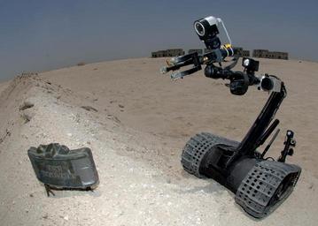 Keywords: Defense.gov News Photo 050414-N-5526M-012.jpg en A Navy Talon 3B robot approaches a claymore land mine on a sand dune during a training exercise at a training range in Djibouti Africa on April 14 2005 Navy Explosive Ordnance Disposal technicians from Mobile Unit 4 operate the robot from safe locations through the use of monitors and video equipment attached to the robot The robot is designed for the search and destruction of Improvised Explosive Device's as well as other explosive ordnance commonly found throughout Iraq 鹰爪3B 器人与克莱莫人员 伤雷 架隶属于美国海军的鹰爪3B(Talon 3B)除雷 器人 位于 吉布提的训练 中, 近 枚埋 沙中的克莱莫人员 伤雷 鷹爪3B機器人與克萊莫人員殺傷雷 架隸屬於美 海軍的鷹爪3B(Talon 3B)除雷機器人 位於 吉布 的訓練場中, 近 枚埋 沙中的克萊莫人員殺傷雷 050414-N-5526M-012 Navy http //www defense gov/photos/newsphoto aspx newsphotoid 6608 2005-04-14 en Petty Officer 1st Class Robert R McRill U S Navy PD-USGov-Military-Navy Defense gov news media for April 2005 Import by User Slick-o-bot/Defense gov News Photos Taken with Nikon D2X M18 Claymore EOD robots Photographs by Robert R McRill Foster-Miller TALON |