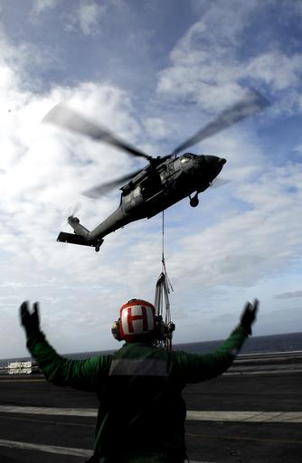 | Keywords: Defense.gov News Photo 090207-N-6538W-040.jpg en U S Navy Petty Officer 3rd Class Marcus J McElroy directs an MH-60S Sea Hawk from Helicopter Sea Combat Squadron 8 over the flight deck of the aircraft carrier USS John C Stennis CVN 74 during a vertical replenishment operation with the USNS Kiska T-AE 35 in the Pacific Ocean on Feb 7 2009 The Stennis and Carrier Air Wing 9 are on a six-month deployment to the Western Pacific 090207-N-6538W-040 http //www defense gov/photos/newsphoto aspx newsphotoid 10957 2009-02-07 en Petty Officer 3rd Class Walter M Wayman U S Navy PD-USGov-Military Import by User Slick-o-bot/Defense gov News Photos SH-60 Seahawk Taken with Nikon D200 USS John C Stennis CVN-74 flight deck |