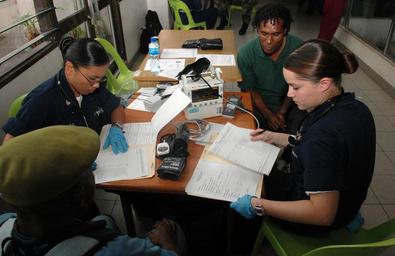 Keywords: Defense.gov News Photo 080805-N-1328S-001.jpg en U S Navy Petty Officers 3rd Class Reneline Llamas and Ashley Kilgore check the vital signs of patients before referring them to the USNS Mercy T-AH 19 for treatment during a surgical screening at Port Moresby General Hospital in Port Moresby Papua New Guinea on Aug 5 2008 The Mercy is in Papua New Guinea for Pacific Partnership 2008 a multinational exercise with participation from nongovernmental organizations and joint services providing local communities with various medical dental and engineering services 080805-N-1328S-001 http //www defense gov/photos/newsphoto aspx newsphotoid 10465 2008-08-05 en Petty Officer 2nd Class James Seward U S Navy PD-USGov-Military Import by User Slick-o-bot/Defense gov News Photos Defense gov photos requiring renaming Taken with Nikon D70s Images from United States Navy to check USNS Mercy T-AH-19 |