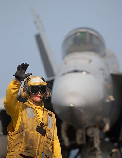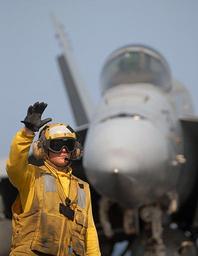 | Keywords: Defense.gov News Photo 080513-N-5384B-036.jpg  en A U S Navy aircraft director signals to a tractor driver during flight operations aboard the Nimitz-class aircraft carrier USS Abraham Lincoln CVN 72 while underway in the Persian Gulf on May 13 2008 The Lincoln is deployed to the U S Navy 5th Fleet area of responsibility to support maritime security operations 080513-N-5384B-036 http //www defense gov/photos/newsphoto aspx newsphotoid 10231 2008-05-13 en Petty Officer 3rd Class Justin Blake U S Navy PD-USGov-Military Import by User Slick-o-bot/Defense gov News Photos Aboard USS Abraham Lincoln CVN-72 Taken with Nikon D200 USS Abraham Lincoln CVN-72 flight deck |