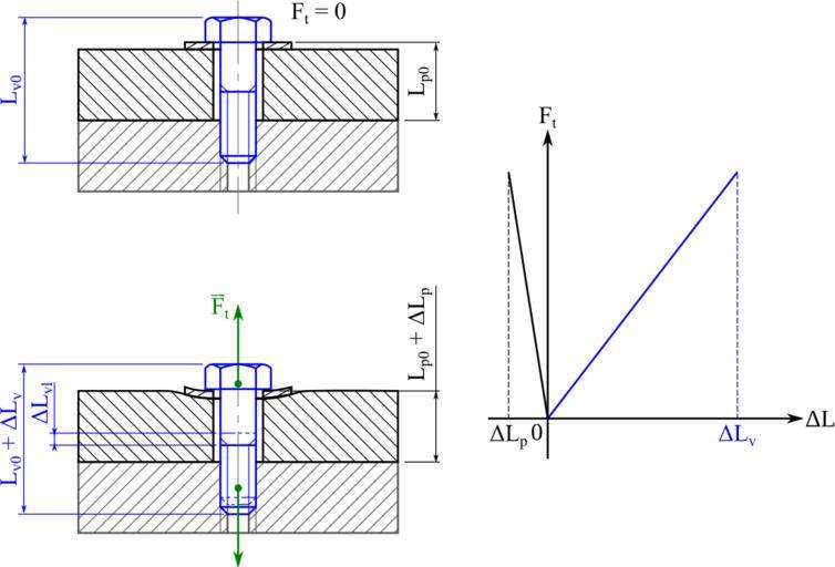 Keywords: Deformation sous precharge assemblage visse.svg fr Déformation élastique d'un assemblage vissé sous l'effet de la précharge L<sub>v0</sub> longueur initiale de la vis ; ΔL<sub>v</sub> allongement de la vis sous précharge ΔL<sub>vl</sub> allongement de la partie lisse ΔL<sub>vf</sub> allongement de la partie filetée ; L<sub>p</sub> épaisseur initiale de la pièce ; ΔL<sub>p</sub> variation d'épaisseur de la pièce ; F<sub>t</sub> force de précharge en Elastic deformation of a screw assembly under the prestrain L<sub>v0</sub> initial length of the screw; ΔL<sub>v</sub> variation of the length of the screw under the prestrain ΔL<sub>vl</sub> stretching of the smooth part ΔL<sub>vf</sub> stretching of the threaded part; L<sub>p</sub> initial thickness of the part; ΔL<sub>p</sub> variation of the thickness of the part; F<sub>t</sub> strength fo prestrain 2013-03-20 own Cdang similar but with a bolt File Deformation sous precharge assemblage boulonne svg inkscape cdang Drawings of screws Elastic deformation Cc-zero