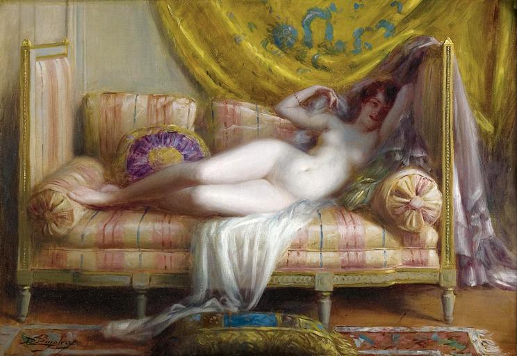 | Keywords: Delphin Enjolras - Odalisque.jpg Artwork Creator Delphin Enjolras Oil on Canvas Size cm 55 38 object history en Acquired directly from the artist; thence by descent exhibition history credit line place of creation D Enjolras lower left signature http //www sothebys com/en/auctions/ecatalogue/2007/19th-century-paintings-including-spanish-painting-and-symbolism-the-poetic-vision-l07103/lot 390 html Sothebys com http //www sothebys com/content/dam/stb/lots/L07/L07103/L07103-390-lr-1 jpg direct link accession number PD-old-auto 1945 Paintings of nude recumbent females Nude or partially nude women looking at viewer in art Paintings of Odalisques Nude women with red hair in art Delphin Enjolras Images from Sotheby's Nude women in bed in art |