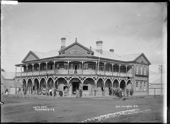 Keywords: blackandwhite monochrome photo border outdoor architecture building black and white View of Simmelhag's Delta Hotel at Ngaruawahia. The proprietor's name, H. Ryan, is on a board immediately above the main entrance. He is listed in Wise's as being the proprietor in 1912. Photographed by G & C Ltd (Probably Green & Colebrook, merchants, with a branch in Ngaruawahia) Inscriptions: Inscribed - Photographer's title on negative -bottom left: Delta Hotel. Ngaruawahia. 119bottom right: G & C Ltd. Protd 1.8.10. Quantity: 1 b&w original negative(s). Physical Description: Dry plate glass negative 4.5 x 6.5 inches Green & Colebrook (Firm). Delta Hotel at Ngaruawahia, 1910 - Photograph taken by Green & Colebrook. Price, William Archer, 1866-1948 :Collection of post card negatives. Ref: 1/2-001601-G. Alexander Turnbull Library, Wellington, New Zealand. natlib.govt.nz/records/23151244 View of Simmelhag's Delta Hotel at Ngaruawahia. The proprietor's name, H. Ryan, is on a board immediately above the main entrance. He is listed in Wise's as being the proprietor in 1912. Photographed by G & C Ltd (Probably Green & Colebrook, merchants, with a branch in Ngaruawahia) Inscriptions: Inscribed - Photographer's title on negative -bottom left: Delta Hotel. Ngaruawahia. 119bottom right: G & C Ltd. Protd 1.8.10. Quantity: 1 b&w original negative(s). Physical Description: Dry plate glass negative 4.5 x 6.5 inches Green & Colebrook (Firm). Delta Hotel at Ngaruawahia, 1910 - Photograph taken by Green & Colebrook. Price, William Archer, 1866-1948 :Collection of post card negatives. Ref: 1/2-001601-G. Alexander Turnbull Library, Wellington, New Zealand. natlib.govt.nz/records/23151244 |
