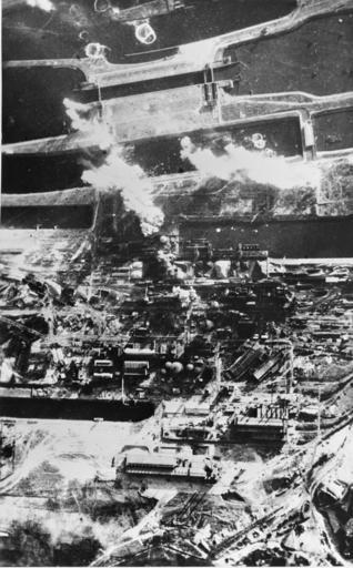 | Keywords: Den Helder docks being bombed in 1943.jpg View of an attack by Royal Air Force bombers on the harbour of Den Helder the Netherlands in 1943 <br>Original caption Royal Air Force Ventura bombers blitz Den Helder in daylight Ventura aircraft of Royal Air Force bomber command escorted by fighters attacked the docks at Den Helder by daylight on February 12 1943 Their previous visit to the Dutch port was January 23 Action photo taken during the attack shows many bombs bursting across the southern entrance to the naval basin--four of them in the inner haven Naval Hits were scored on the torpedo boat establishment and the torpedo workshops east of the entrance Smoke arises from bombs which burst in a line across the railway in the southwest part of the harbor LOC-image fsa 8e01169 1943-02-12 British official photo from U S Office of War Information frame removed PD-USGov Den Helder World War II in February 1943 Air War over Western Europe in World War II |