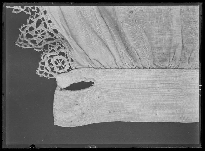 | Keywords: Den innersta av Gustav II Adolfs Lützenskjortor - Livrustkammaren - 43756.tif LSH artwork sv Skjortan är sydd av 3 stora stycken l ca 1425 mm som kan iakttagas frÃ¥n krage till nederfÃ¥ll VÃ¥dbredden är 920 mm som kan konstateras frÃ¥n V nedre sprundet där staden gÃ¥r till fällsömmen i H sida Den smala ökningsvÃ¥den pÃ¥ H sida är 220 + 220 mm bred 440 mm H framstyckspartiet har spÃ¥r av skarvsömmen stadkanten är 500 mm lÃ¥ng utefter H sidsöm pÃ¥ framstycket som är en kastfÃ¥ll - sydd frÃ¥n avigsidan kastad stad mot stad 10 V-vända kaststygn / cm Intill denna söm har en rektangulär lucka rivits ut 190 x 40 mm Ärmens spjäll och andra fÃ¥llar är fällsömmar med 9 stygn / cm Spetsarna är kastade med ca 6 stygn / cm <br/>Av kragen finns en 230 mm lÃ¥ng flisa utefter kantfÃ¥llen nedtill Spetsen är delvis lossliten - sitter fast blott 50 mm och är myckt blodig L ca 130 mm Kragen är 60 mm hög och dubbelvikt <br/>Skjortan är inveckad med täta rynkor i kragen 20 rynkor / cm och sydd med 10 kaststygn och 7 efterstygni garneringssömmen / cm närmast rynkorna och 6 stygn ytterst Spetsen är 50 resp 20 mm hög <br/>Manschetten är 48 mm bred Sprundet är bevarat 70 mm lÃ¥ngt C a 14 rynkor / cm och 8 resp 6 garneringsstygn / cm Spetsen är fastkastad med ca 8 stygn Ã¥t V med vitt lingarn <br/>KastfÃ¥llen i skjortans nederkant är 15 mm bred och nedkastad med ca 9 stygn / cm H-vända med samma trÃ¥dsom skjortans - Varpen otvinnad inslaget ev svagt V-tvinnat <br/>Ett litet stycke av skjortan utgöres av en smal mycket blodig remsa frÃ¥n ena ärmen med kvarsittandespetsgarnering och en liten rest av manschetten Härav kan man fastställa ärmlängden till ca 590 mm dÃ¥sömmen mot skjortans bÃ¥lparti bevarats knappt 80 mm PÃ¥ detta stycke finns ca 140 mm kvar av aelsömmen som är en fällsöm som smalnar mot axeln <br/>Skjortans minsta smala remsa är ett stycke av V ärm som passar i den hackiga konturen pÃ¥ ärmens minstblodia parti med den mellersta myckt blodiga spetsen Detta stycke har sÃ¥väl ett stycke av skjortansaxelsöm 140 mm som lagts omlott i en sneddad söm mellan 7-14 mm bred Garneringssömmen sydd med 7stygn / cm I fortsättningen av den blott knappt 30 mm breda remsan med spetsen centralt nedtill sitteren 5 mm bred flisa av manschetten kvar med del av spets ocksÃ¥ Blott ca 480 mm av spetsens längd finns dock kvar här de översta 110 mm är bortrivna Av V ärms V axelparti finns av framstycket ett revat parti som överst har den vikta fÃ¥llen som är 145mm lÃ¥ng Efter 30 mm nerÃ¥t är en med sömmen parallell reva ca 90 mm lÃ¥ng sÃ¥ att blott en 15 mm bredtunga hÃ¥ller samman det snedrivna stycket som tillkommer med en längd av 170 mm och höjd av 130 mm Bakstycket som har en längd av 135 mm vid fÃ¥llen mot framstycket är ungefär jämnbrett med ca 110 mmbredd och nederst 240 mm lÃ¥ngt <br/>Gemensamt <br/>Av linnelärft med trÃ¥dantal 43 varptrÃ¥dar x 44 inslagstrÃ¥dar / cm2 sammanfogad av framstycke bakstycke b 1470 mm sidstycke samt ärmar ärmspjäll krage och ärmlinningar I sidorna har nertill ämnats ca 510mm höga sprund staden är synlig här i v sida Skjortans bÃ¥lparti är rakt tillskuret Nedtill harskjortan fÃ¥llats upp med en 15-20 mm bred fÃ¥ll sydd med 5 à 6 stygn/cm av H-tvinnat lingarn Derektangulärt tillskurna ärmarna blott den v nÃ¥gorlunda bevarad är 610 mm lÃ¥nga och 460 mm breda ochgarnerade med 3 rader knappt 20 mm breda vita knypplade mellanspetsar pÃ¥sydda med ca 100 mm mellanrum Ärmarna är fastsydda i skjortans sidsöm pÃ¥ v sida där staderna stöta mot varandra I h sida har manklippt upp ett 390 mm lÃ¥ngt sprund för ½ ärmbredden 230 mm + spjäll 160 mm 390 mm Nedanförärmstycket har alltsÃ¥ ett spjäll med ca 160 mm sida sytts fast Ärmarna är alltsÃ¥ isydda helt normalt och inte som Anna Maja Nylén förmodat enligt en mer egendomlig konstruktion sÃ¥ att ärmen skulle nÃ¥ ändafram till halslinningen <br/>Axelsömmarna är i det allra närmaste helt raka de yttersta 165 mm Man har blott vikt ner fÃ¥llarna nÃ¥gotbredare mot axeln än mot halsen ca 5 mm differens Härefter har ll Ã¥terstÃ¥ende vidd rynkats in i dendubbelvikta knappt 70 mm hÃ¥ga kragen som är ca 400 mm lÃ¥ng sÃ¥ att frampartierna av skjortorna fördelatspÃ¥ kragens främre decimeterlÃ¥nga stycken medan ryggstycket rynkats i kragens bakre 200 mm <br/>Halssprundet är klippt upp vertikalt i framstycket l minst 270 mm synligt i h sida därspetsgarneringen bevarats en 15 mm bred uddspets Dessutom kan pÃ¥pekas att sprundet ej placerats heltsymmetriskt mitt pÃ¥ skjortans framstycke utan med ett par centimeters förskjutning Ã¥t h dÃ¥ det klipptsca 600 mm frÃ¥n v sidsöm och 230 + 350 580 mm frÃ¥n h sida Dekor av en 15 mm bred uddspets rapport 20mm Överst pÃ¥ kragen är denna typ av spets fastsydd för att stÃ¥ upp som en avslutande kant PÃ¥ kragensutsida är kant i kant med den smala spetsen och nedÃ¥t en bredare uddspets fastsydd Denna är 50 mm bredoch har en rapport av 22 mm motivet pÃ¥minner om solfjädrar <br/>Kragens garneringssömmar sydda med efterstygn i 2 parallella rader med 7 stygn/cm och 16 rynkor avskjortan / cm Spetsen är fastkastad med 7 stygn / cm med H-tvinnat lingarn <br/>H axelsöm är en fällsöm lik den pÃ¥ skjorta C 14-3 mm bred och 165 mm lÃ¥ng Den är sydd med 3 sömmar med eftersygn Av v sidostycke ryggstycket framgÃ¥r att skjortans sidosprund sannolikt varit ca 510 mm lÃ¥ngt Isjälva sömmen är plagget emellertid uppfläkt Den V ärmen som är rel bra bevarad är nedtill vid linningen som klippts upp oerhört blodig Denhar ett ca 70 mm lÃ¥ng ärmsprund - sönderrivet och manschetten är ca 45 mm hög hur lÃ¥ng kan ej avgöras En 17 mm bred mellanspets med hjulmotiv rapport 25 mm har som garnering sytts pÃ¥ ärmarna i 3rader ända uppifrÃ¥n axelsömmen och ned till är