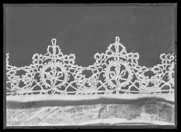 Keywords: Den yttersta av Gustav II Adolfs Lützenskjortor - Livrustkammaren - 77986.tif LSH artwork sv Rester av skjorta i 3 delar ryggstycke med en bit av kragen v framstycke med kragstycke och större delen av ärmen samt h framstycke med kragens främre halva och en del av bakstycket <br/><br/>1 Ryggstycket med en bit av kragen <br/>Skjortans vådbredd har i h ö sida utökats med en våd av 460 mm som tillför plagget en bredd av 230 mm på resp fram- och bakstycket På ryggsidan är denna fåll gjord som stad mot stad - sammankastad fåll från avigsidan av plagget 7 kaststygn åt v med H-tvinnat lingarn Av denna fåll finns nerifrån kantfållen kvar 350 mm sedan har sannolikt från sprundet klippts och rivits en stor lucka av sömmen saknas 360 mm sedan kommer på nytt ett 630mm långt stycke av kastfållen Okstycket är här blott ett oregelbundet klippt stycke med snedklippt överkant På V sida som rivits av utefter sidfållen - fällsömmen finns blott ytterligare ett stycke av ärmspjället kvar och en liten bit 40 mm av dess söm mot ärmen Spjällets kant är här 150 mm Fållen sydd med h-tvinnat lingarn med 6 stygn /cm och drygt 1 mm bredd Av kragen återstår i underkanten en 145 mm lång bit Upptill blott en 100 mm lång bit där spetsen sytts fast med 8 stygn kast- åt V/cm med H-tvinnat lingarn Kragen är 670 mm hög I kragen har ca 16 rynkor stripats och 7 kaststygn åt H sytts ned på rätan och ca 7 stygn/cm i de tättplacerade parallella garneringssömmarna Hela arrangemanget är ej mer än 3 mm brett H-tvinnatlingarn har använts till garneringssömmarna Den breda uddspetsen med bl a flätslag är 50 mm bred den smala 15 mm Den breda har en rapport av ca 24 mm <br/><br/>2 Ett stycke av skjortans V framsida med kragstycke och större delen av ärmen <br/>Största längd fram är från kragens underkant max 530 mm och 140 mm halssprund finns kvar Här är också vådbredden bevarad mellan halssprund och ärmsöm Av ärmsömmen finns det 290 mm kvar varav 220 ovanför spjället som alltså är bevarat som en 70 mm bred remsa och här är spjället klippt snett ½ våden verkar då att vara 595 à 600 mm bred på v bröstsida Slätt parti fram på axeln är ungefär 200 mm enligt detta stycke att döma Ärmmanschetten är 45 mm bred med stripade veck ca 12 veck/cm och 7 stygn såväl mellan dessa som i de 2 garneringsraderna hela dekorens bredd 3 mm Spetsen är densamma som på kragen Manschettstyckena är mycket blodiga <br/><br/>3 H framstycke fr o m halssprundet med kragens främre halva och en del av bakstycket av kragen hela axelsömmen samt en övre del av ärmen med spjället - som dock har en reva En ände till1150 mm nående remsa finns av skjortans framstycke från axelsömmen räknat Nederst är denna blott 110 mm bred och då den tydligen har klippts av när tyget redan låg veckat är dess kant uddig souvenir Axelsömmen är 160 mm och sneddad så att den är 130 mm vid axeln men krymper till blott ett par mm vid halsen På rätsidan är det ryggstycket som går över framstycket 3 sömmar med 7-8 stygn/cm Det övriga tyget - de ca 420 mm har rynkats samman i kragen till 100 mm Fällsömmen som förenar framstyckets med sidovåden är gjord för att bli särskilt smidig från skjortans insida med 7 kaststygn åt V gjort från rätan över staden Fållen är blott millimeterbred Av kragen finns i nederkanten en 160 mm lång bit I överkanten är den dock inte mycket mer än 130mm från hörnet räknat Längs överkanten står den smala uddspetsen upp och den löper utefter halssprundet mitt fram På kragens horisontella del är från överkanten och nedfallande en bredare uddspets fästad <br/><br/>Gemensamt <br/><br/>Av linnelärft med trådantal 43 varptrådar x 44 inslagstrådar / cm2 sammanfogad av framstycke bakstycke b 1470 mm sidstycke samt ärmar ärmspjäll krage och ärmlinningar I sidorna har nertill ämnats ca 510 mm höga sprund staden är synlig här i v sida Skjortans bålparti är rakt tillskuret Nedtill har skjortan fållats upp med en 15-20 mm bred fåll sydd med 5 à 6 stygn/cm av H-tvinnat lingarn De rektangulärt tillskurna ärmarna blott den v någorlunda bevarad är 610 mm långa och 460 mm breda och garnerade med 3 rader knappt 20 mm breda vita knypplade mellanspetsar påsydda med ca 100 mm mellanrum Ärmarna är fastsydda i skjortans sidsöm på v sida där staderna stöta mot varandra I h sida har man klippt upp ett 390 mm långt sprund för ½ ärmbredden 230 mm + spjäll 160 mm 390 mm Nedanför ärmstycket har alltså ett spjäll med ca160 mm sida sytts fast Ärmarna är alltså isydda helt normalt och inte som Anna Maja Nylén förmodat enligt en mer egendomlig konstruktion så att ärmen skulle nå ända fram till halslinningen <br/><br/>Axelsömmarna är i det allra närmaste helt raka de yttersta 165 mm Man har blott vikt ner fållarna något bredare mot axeln än mot halsen ca 5 mm differens Härefter har ll återstående vidd rynkats in i den dubbelvikta knappt 70 mm håga kragen som är ca 400 mm lång så att frampartierna av skjortorna fördelats på kragens främre decimeterlånga stycken medan ryggstycket rynkats i kragens bakre 200 mm <br/><br/>Halssprundet är klippt upp vertikalt i framstycket l minst 270 mm synligt i h sida där spetsgarneringen bevarats en 15 mm bred uddspets Dessutom kan påpekas att sprundet ej placerats helt symmetriskt mitt på skjortans framstycke utan med ett par centimeters förskjutning åt h då det klippts ca 600 mm från v sidsöm och 230 + 350 580 mm från h sida Dekor av en 15 mm bred uddspets rapport 20 mm Överst på kragen är denna typ av spets fastsydd för att stå upp som en avslutande kant På kragens utsida är kant i kant med den smala spetsen och nedåt en bredare uddspets fastsydd Denna är 50 mm bred och har en rapport av 22 mm motivet påminner om solfjädrar <br/><br/>Kragens garneringssömmar sydda med efterstygn i 2 parallella rader med 7 stygn/cm och 16 rynkor av 