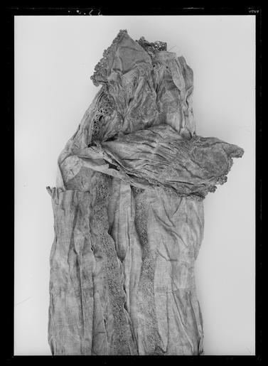 | Keywords: Den yttersta av Gustav II Adolfs Lützenskjortor - Livrustkammaren - 43745.tif LSH artwork sv Rester av skjorta i 3 delar ryggstycke med en bit av kragen v framstycke med kragstycke och större delen av ärmen samt h framstycke med kragens främre halva och en del av bakstycket <br/><br/>1 Ryggstycket med en bit av kragen <br/>Skjortans vådbredd har i h ö sida utökats med en våd av 460 mm som tillför plagget en bredd av 230 mm på resp fram- och bakstycket På ryggsidan är denna fåll gjord som stad mot stad - sammankastad fåll från avigsidan av plagget 7 kaststygn åt v med H-tvinnat lingarn Av denna fåll finns nerifrån kantfållen kvar 350 mm sedan har sannolikt från sprundet klippts och rivits en stor lucka av sömmen saknas 360 mm sedan kommer på nytt ett 630mm långt stycke av kastfållen Okstycket är här blott ett oregelbundet klippt stycke med snedklippt överkant På V sida som rivits av utefter sidfållen - fällsömmen finns blott ytterligare ett stycke av ärmspjället kvar och en liten bit 40 mm av dess söm mot ärmen Spjällets kant är här 150 mm Fållen sydd med h-tvinnat lingarn med 6 stygn /cm och drygt 1 mm bredd Av kragen återstår i underkanten en 145 mm lång bit Upptill blott en 100 mm lång bit där spetsen sytts fast med 8 stygn kast- åt V/cm med H-tvinnat lingarn Kragen är 670 mm hög I kragen har ca 16 rynkor stripats och 7 kaststygn åt H sytts ned på rätan och ca 7 stygn/cm i de tättplacerade parallella garneringssömmarna Hela arrangemanget är ej mer än 3 mm brett H-tvinnatlingarn har använts till garneringssömmarna Den breda uddspetsen med bl a flätslag är 50 mm bred den smala 15 mm Den breda har en rapport av ca 24 mm <br/><br/>2 Ett stycke av skjortans V framsida med kragstycke och större delen av ärmen <br/>Största längd fram är från kragens underkant max 530 mm och 140 mm halssprund finns kvar Här är också vådbredden bevarad mellan halssprund och ärmsöm Av ärmsömmen finns det 290 mm kvar varav 220 ovanför spjället som alltså är bevarat som en 70 mm bred remsa och här är spjället klippt snett ½ våden verkar då att vara 595 à 600 mm bred på v bröstsida Slätt parti fram på axeln är ungefär 200 mm enligt detta stycke att döma Ärmmanschetten är 45 mm bred med stripade veck ca 12 veck/cm och 7 stygn såväl mellan dessa som i de 2 garneringsraderna hela dekorens bredd 3 mm Spetsen är densamma som på kragen Manschettstyckena är mycket blodiga <br/><br/>3 H framstycke fr o m halssprundet med kragens främre halva och en del av bakstycket av kragen hela axelsömmen samt en övre del av ärmen med spjället - som dock har en reva En ände till1150 mm nående remsa finns av skjortans framstycke från axelsömmen räknat Nederst är denna blott 110 mm bred och då den tydligen har klippts av när tyget redan låg veckat är dess kant uddig souvenir Axelsömmen är 160 mm och sneddad så att den är 130 mm vid axeln men krymper till blott ett par mm vid halsen På rätsidan är det ryggstycket som går över framstycket 3 sömmar med 7-8 stygn/cm Det övriga tyget - de ca 420 mm har rynkats samman i kragen till 100 mm Fällsömmen som förenar framstyckets med sidovåden är gjord för att bli särskilt smidig från skjortans insida med 7 kaststygn åt V gjort från rätan över staden Fållen är blott millimeterbred Av kragen finns i nederkanten en 160 mm lång bit I överkanten är den dock inte mycket mer än 130mm från hörnet räknat Längs överkanten står den smala uddspetsen upp och den löper utefter halssprundet mitt fram På kragens horisontella del är från överkanten och nedfallande en bredare uddspets fästad <br/><br/>Gemensamt <br/><br/>Av linnelärft med trådantal 43 varptrådar x 44 inslagstrådar / cm2 sammanfogad av framstycke bakstycke b 1470 mm sidstycke samt ärmar ärmspjäll krage och ärmlinningar I sidorna har nertill ämnats ca 510 mm höga sprund staden är synlig här i v sida Skjortans bålparti är rakt tillskuret Nedtill har skjortan fållats upp med en 15-20 mm bred fåll sydd med 5 à 6 stygn/cm av H-tvinnat lingarn De rektangulärt tillskurna ärmarna blott den v någorlunda bevarad är 610 mm långa och 460 mm breda och garnerade med 3 rader knappt 20 mm breda vita knypplade mellanspetsar påsydda med ca 100 mm mellanrum Ärmarna är fastsydda i skjortans sidsöm på v sida där staderna stöta mot varandra I h sida har man klippt upp ett 390 mm långt sprund för ½ ärmbredden 230 mm + spjäll 160 mm 390 mm Nedanför ärmstycket har alltså ett spjäll med ca160 mm sida sytts fast Ärmarna är alltså isydda helt normalt och inte som Anna Maja Nylén förmodat enligt en mer egendomlig konstruktion så att ärmen skulle nå ända fram till halslinningen <br/><br/>Axelsömmarna är i det allra närmaste helt raka de yttersta 165 mm Man har blott vikt ner fållarna något bredare mot axeln än mot halsen ca 5 mm differens Härefter har ll återstående vidd rynkats in i den dubbelvikta knappt 70 mm håga kragen som är ca 400 mm lång så att frampartierna av skjortorna fördelats på kragens främre decimeterlånga stycken medan ryggstycket rynkats i kragens bakre 200 mm <br/><br/>Halssprundet är klippt upp vertikalt i framstycket l minst 270 mm synligt i h sida där spetsgarneringen bevarats en 15 mm bred uddspets Dessutom kan påpekas att sprundet ej placerats helt symmetriskt mitt på skjortans framstycke utan med ett par centimeters förskjutning åt h då det klippts ca 600 mm från v sidsöm och 230 + 350 580 mm från h sida Dekor av en 15 mm bred uddspets rapport 20 mm Överst på kragen är denna typ av spets fastsydd för att stå upp som en avslutande kant På kragens utsida är kant i kant med den smala spetsen och nedåt en bredare uddspets fastsydd Denna är 50 mm bred och har en rapport av 22 mm motivet påminner om solfjädrar <br/><br/>Kragens garneringssömmar sydda med efterstygn i 2 parallella rader med 7 stygn/cm och 16 rynkor a