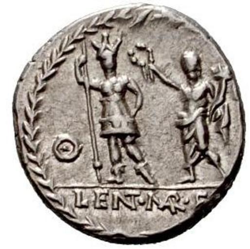 | Keywords: Denarius Publius Cornelius Lentulus Marcellinus 1 Reverse.jpg en d 18 mm P Cornelius Lentulus Marcellinus Denarius circa 100 AR 3 92 g Bust of Hercules seen from behind with lion skin over shoulder and head turned r ; club over far shoulder In field l shield and below chin Q Rev Roma standing facing holding spear crowned by male figure standing l and holding cornucopiae in l hand; in field l Q In exergue LENT·MAR·F The whole within laurel wreath FFC 620 B Cornelia 25 Syd 604a Cr 329/1b ru Дена ий се еб о Дата чеканки 100 г до н э онетный дво Рим вес 3 92 г диамет 18 мм АВЕРС Бюст молодого Ге кулеса в шку е льва вп аво отве нушись от з ителя; на левом плече дубина; за головой щит; под бюстом ROMA; спе еди г еческая буква Ο с точкой Кайма из точек РЕВЕРС Рома в домпехах стоит анфас де жит копье упе евшись левой укой в бед о; ее увенчивает венком Гений имского на ода кото ый де жит ог изобилия в левой уке; в поле слева г еческая буква Ο с точкой В об езе LENT MAR F NT MAR моног аммой Lentulus Marcelli filius Кайма из лав ового венка http //www acsearch info/record html id 133770 Author I century B C Denarius Publius Cornelius Lentulus Marcellinus moneyer 100 BC Personifications of Rome PD-old |