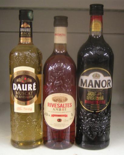 Keywords: Denominacio d'origen Ribesaltes.jpg ca A l'esquerra una ampolla de muscat semblant al moscatell pero un pel menys dolç i més claret de Ribesaltes a la Catalunya Nord Al centre una ampolla de vi blanc ambré de Ribesaltes i a la dreta una de vi negre tuilé de Ribesaltes Les ampolles son transparents i totes tres tenen sempre tradicionalment ornaments en relleu de vidre mateix Fixeu-vos en els colors diferents a cada tipus de vi own Slastic 2010 Rivesaltes VDN Taken with Minolta Dimage Xt