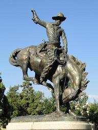 Keywords: denver colorado statue monument cowboy horse sky clouds trees outside artistic sculpture city urban
