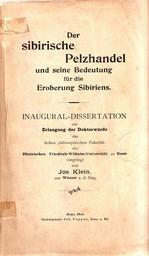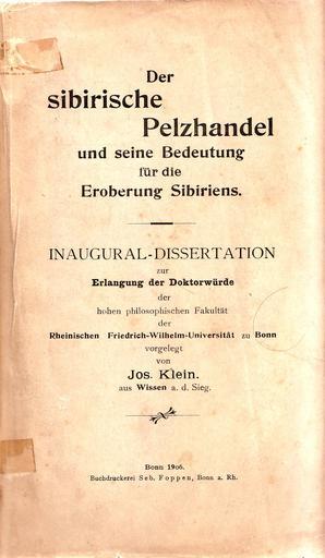 Keywords: Der sibirische Pelzhandel und seine Bedeutung für die Eroberung Sibiriens, Jos. Klein, 1906.jpg Jos Klein Wissen an der Sieg Der sibirische Pelzhandel und seine Bedeutung für die Eroberung Sibiriens Titelblatt Inaugural-Dissertation zur Erlangung der Doktorwürde der hohen philosophischen Fakultät der Rheinischen Friedrich-Wilhelm Universität zu Bonn vorgelegt von Jos Klein aus Wissen a d Sieg Bonn 1906 Buchdruckerei Seb Foppen Bonn a Rh 200 Seiten aus einer neu gebundenen Ausgabe Collection G C Franke 1906 Jos Klein PD-old Furs literature German Klein Jos Collection G C Franke Fur trade History of Siberia Fur clothing of native people of Siberia 1906 books Books from Germany |
